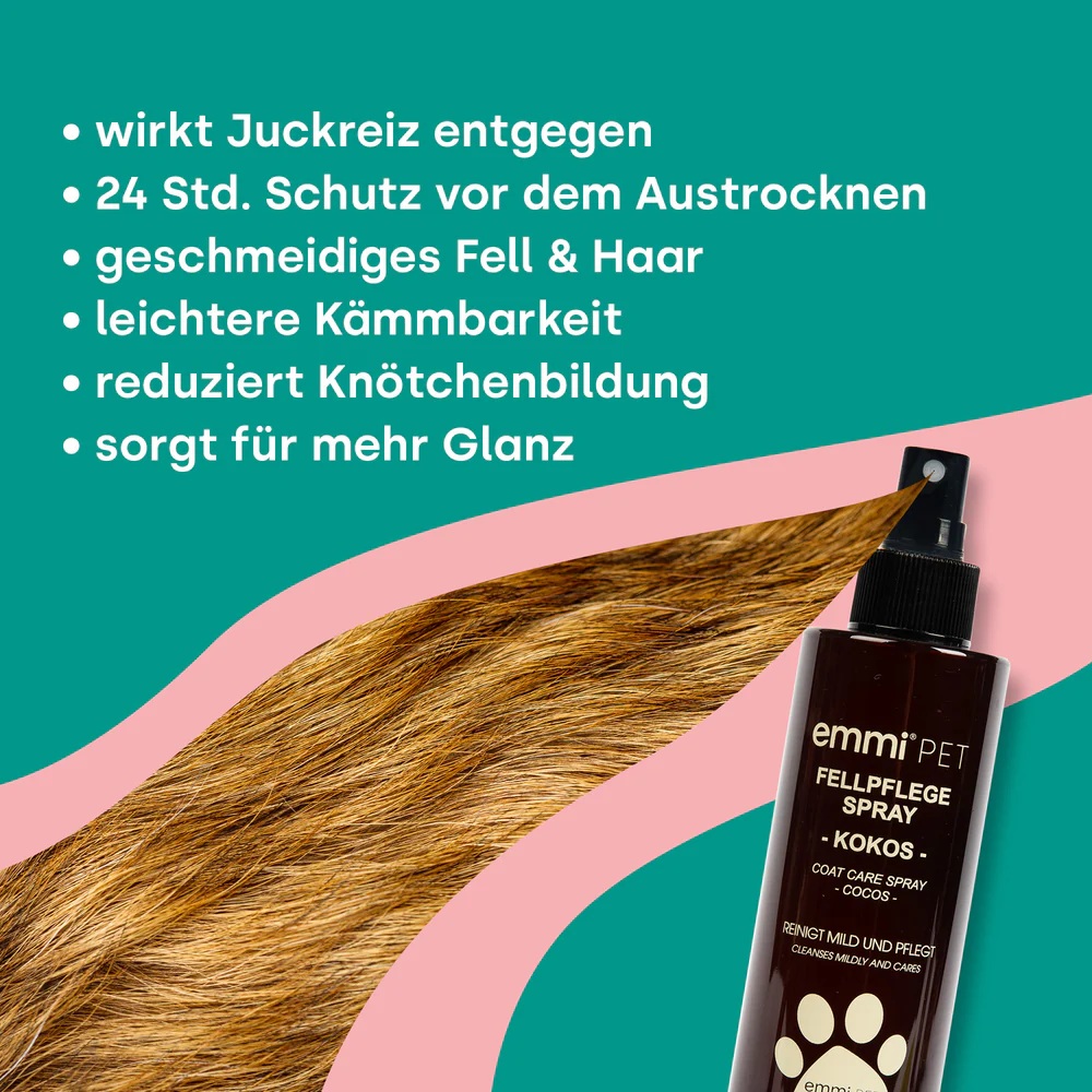 Dank seiner speziellen Pflegeformel mit Kokosextrakt repariert das Spray Strukturschäden, beugt Verfilzungen und Knotenbildung vor und lindert gleichzeitig Juckreiz. Das Fell erhält sichtbar mehr Glanz und bleibt 24 Stunden lang optimal gepflegt – ganz ohne Ausspülen.